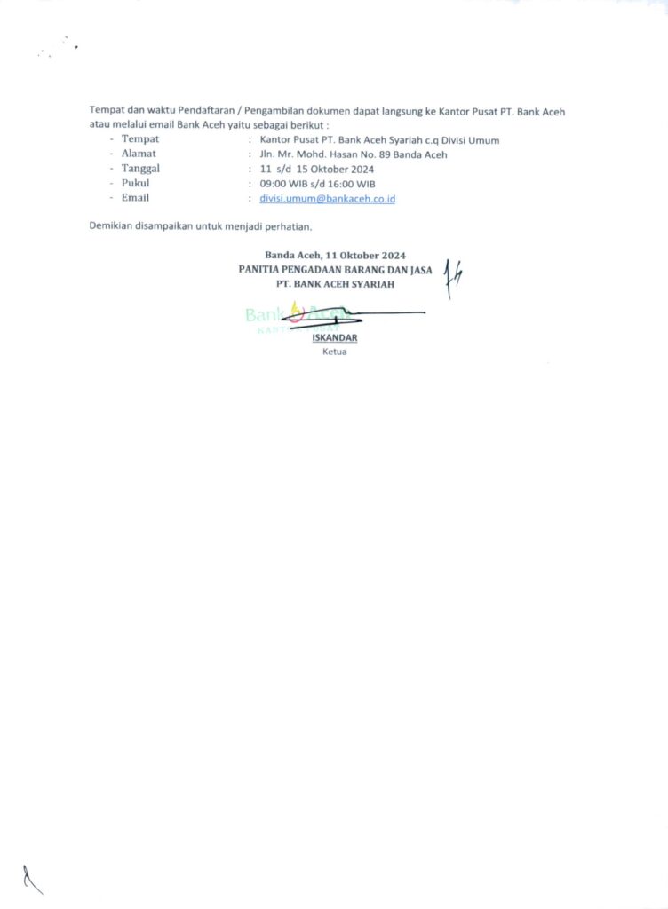 11 Oct, 2024 Pengumuman Tender Pengadaan Kalender Dinding & Meja Bank Aceh Tahun 2025 Berita Ekonomi & Perbankan, Berita Seputar Bank Aceh, Pengumuman